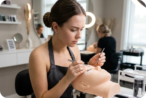 2 dias intensivos de 9h às 18h. Teoria, prática em modelo real, técnica fio a fio e correção em tempo real.